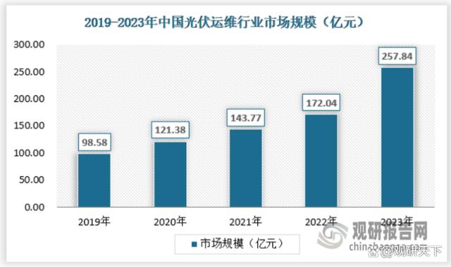 在雙碳目標(biāo)推進下,光伏行業(yè)將長期處于高速發(fā)展期,將帶動光伏運維行業(yè)進一步發(fā)展。伴隨我國光伏發(fā)電累計裝機容量增長迅速,光伏運維市場需求持續(xù)增加,行業(yè)迎來黃金發(fā)展期。2022年我國光伏累計裝機容量約為393GW,2023年我國光伏累計裝機容量約為609GW,同比增長超過55%,因此在光伏累計裝機容量快速增長的情況下,2023年我國光伏運維行業(yè)市場規(guī)模達到257.84億元,同比2022年增長49.87%。