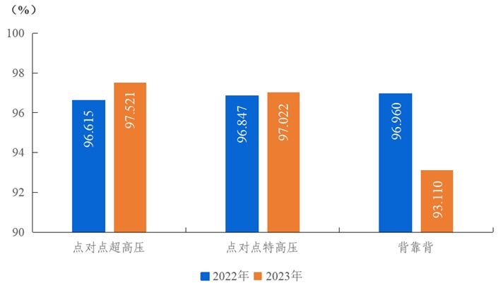 2023年,納入電力可靠性統(tǒng)計的點(diǎn)對點(diǎn)超高壓直流輸電系統(tǒng)能量可用率為97.521%,同比上升0.906個百分點(diǎn);點(diǎn)對點(diǎn)特高壓直流輸電系統(tǒng)能量可用率為97.022%,同比上升0.175個百分點(diǎn);背靠背直流輸電系統(tǒng)能量可用率為93.110%,同比下降3.850個百分點(diǎn)。
