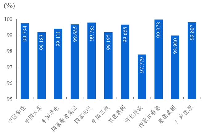 2023年,發(fā)電側(cè)11家集團(tuán)公司變壓器可用系數(shù)前三位分別是廣東省能源集團(tuán)有限公司99.747%、內(nèi)蒙古能源集團(tuán)有限公司99.576%、國家能源投資集團(tuán)有限責(zé)任公司99.097%。