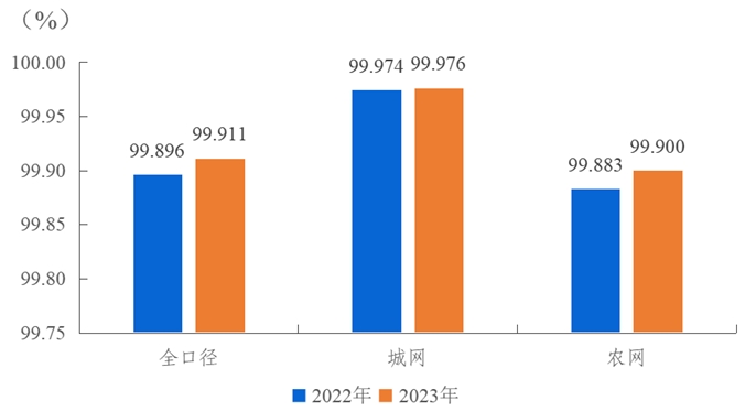 2023年,全國用戶平均供電可靠率99.911%,同比上升0.015個百分點(diǎn),其中,城網(wǎng)99.976%,農(nóng)網(wǎng)99.900%。城網(wǎng)與農(nóng)網(wǎng)相差0.076個百分點(diǎn)。