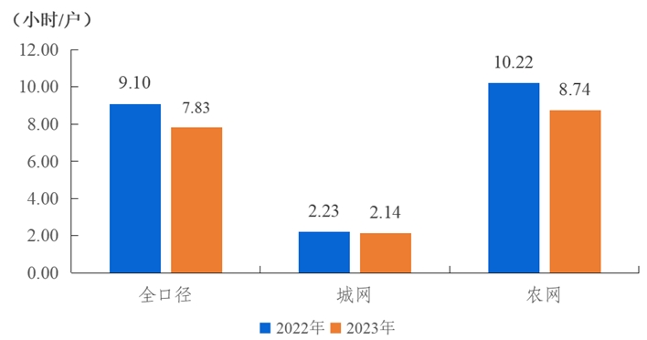 全國用戶平均停電時間7.83小時/戶,同比減少1.27小時/戶,其中城網(wǎng)2.14小時/戶,農(nóng)網(wǎng)8.74小時/戶。城網(wǎng)與農(nóng)網(wǎng)相差6.60小時/戶。