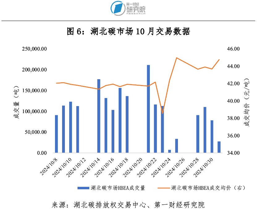 10月湖北碳市場碳排放配額(HBEA)交易成交量193.82萬噸,成交額8143.04萬元。期間,最高價45.50元/噸,最低價38.00元/噸,成交均價42.01元/噸。10月最后一個交易日收盤價44.78元/噸,較9月最后一個交易日收盤價42.16元/噸上漲6.21%。截至10月31日,HBEA(不包括遠(yuǎn)期和拍賣)累計成交量1.34億噸,累計成交額33.35億元。