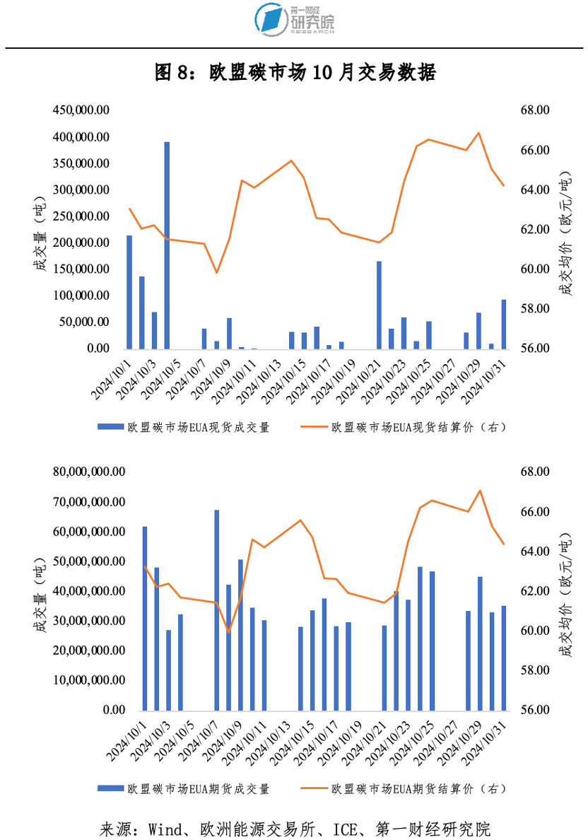 10月歐盟碳排放配額(EUA)現(xiàn)貨成交量161.50萬噸,期貨成交量9.04億噸。10月EUA現(xiàn)貨結(jié)算價最低59.87歐元/噸,最高66.93歐元/噸;期貨結(jié)算價最低59.98歐元/噸,最高67.13歐元/噸。