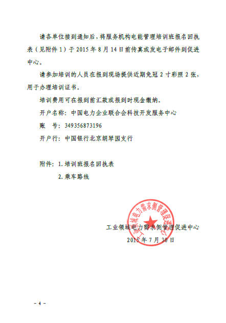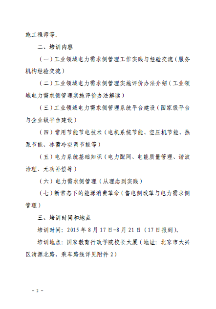 附件: 1、關(guān)于舉辦工業(yè)領(lǐng)域電力需求側(cè)管理服務(wù)機構(gòu)電能管理培訓班通知(工電促[2015]8號) 2、電能管理培訓班報名回執(zhí)